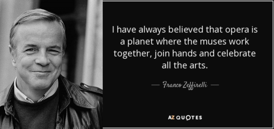 So, while I’m sad that I never got to have that conversation with Franco Zeffirelli, I am nevertheless thankful for the inspiration he provided at the time, showing that film was not just within the purview of pop culture but had the remarkable ability to become its own art form. And in that vein, taking Mr. Zeffirelli's quote about opera in the header above to its next logical conclusion, that film can actually offer a higher artistic statement potential than any other art separately, a living, moving canvas as it were, where word, picture, and music, centered on a unified vision expressed through time and space, can find ever higher and deeper levels of expression by artists who seek to master all three disciplines. It all just depends on where the artist is coming from. But I'll leave that discussion for a later blog.