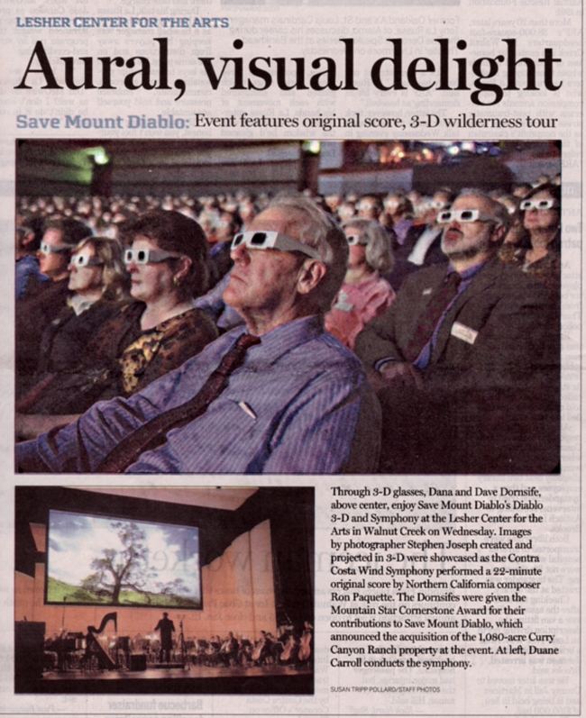 Sentinel of Time was commissioned to celebrate land conservation successes by the nationally accredited land trust conservation group, Save Mount Diablo. It premiered at the Lesher Center for the Arts, Walnut Creek, California on November 6th, 2013. The work was performed live as stunning 3D widescreen images of Mt. Diablo Park, shot by renowned nature photographer, Stephen Joseph, were projected overhead. A 2D version of the entire presentation is prestented above.